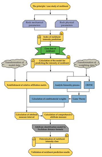 - Based on the improved attribute identification mode, the Euclidean distance formula was used to determine the class of intensity for the rockburst. By summarising elements of the model framework, the overall flow of the framework is made as shown in Figure 1.