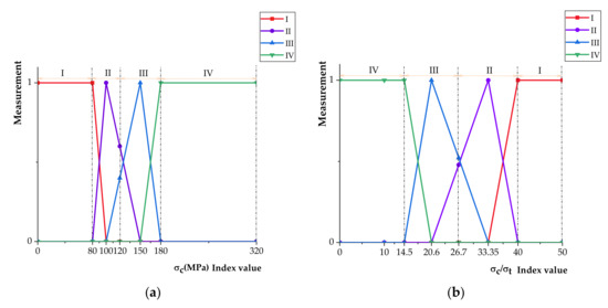 The prediction of rockburst intensity is based on the study of the mechanism of rockburst occurrence. The mechanism and induced conditions for the occurrence of rockburst are still unclear, generally focusing on stress indexes and rock property parameters as the main objects of study. From the many research results [3,4,46,64,65,66,67,68], the stress indexes of rockburst prediction are mainly uniaxial compressive strength of rock , shear compression ratio of rock , compression-tension ratio of rock , and elastic deformation coefficient of rock . Rock property parameters are mainly studied for the integrity coefficient of rock . In this study, five indexes were selected as indexes for predicting rockburst intensity. By consulting the relevant literature, the single index of rockburst intensity classification criteria are listed as shown in Table 2, and the single index measurement is shown in Figure 2.