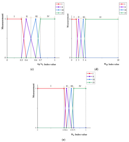 Single index measurement function for rockburst. (a) Measurements of rock uniaxial compressive strength. (b) Measurements of rock compres-sion-tension ratio. (c) Measurements of rock shear compression ratio. (d) Measurements of rock elastic deformation coefficient. (e) Measurements of rock integrity coefficient.