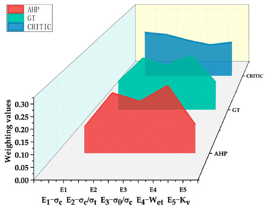 From Section 2.3.1, it is clear that the prediction of rockburst intensity requires index weights as important parameters. The index weights for rock burst not only focus on the data from the sample but also take into account experts’ experience, but a single weighting method cannot fully reflect both aspects. Therefore, the subjective weights are reflected by the Analytic Hierarchy Process, the objective weights are reflected by the CRITIC method, and game theory is used to balance the shortcomings of both to obtain reasonably combined weights.