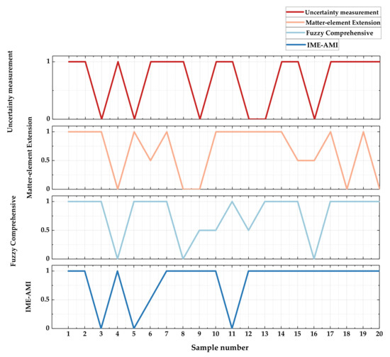 After obtaining the lower bound attribute measure and the upper bound attribute measure of the sample , the compromise coefficient of the compromise decision method is used as a transformed coefficient to transform the attribute measure interval into the averaged attribute measure value of the sample, avoiding ambiguity introduced by the number of intervals used to calculate the attribute measure [54,55,57]. The averaged attribute measure is calculated as follows: