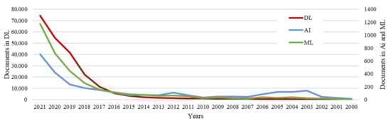 The studies in the field of artificial intelligence (AI) are developed and widely discussed in the scientific community. These studies consider the theoretical aspects of the AI technologies and their applications in many areas of our society. The methods of machine learning (ML) are a group of methods often used in AI, which allow for the prediction of new properties of data based on known properties discovered from the training data. One of the specific areas of ML is deep learning (DL). In recent years, there has been an increased interest in research in this area. It can be illustrated by the number of publications in scientific databases. The graph presented in Figure 1 shows the number of reviews in AI, ML, and DL in Scopus in years 2000–2021.