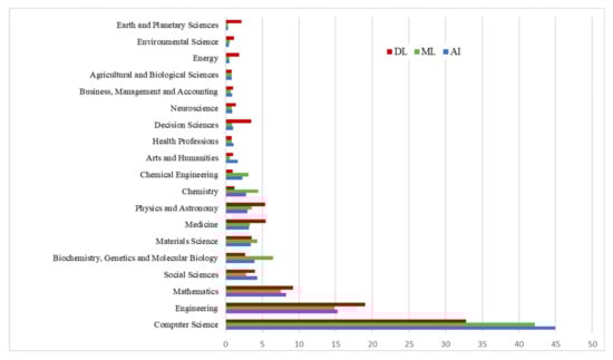 Methods of AI have many practical applications. The applications, which are most often discussed in scientific publications, are shown in Figure 2. The dominant areas of AI, ML, and DL studies are computer science, engineering and mathematics [1,2,3].