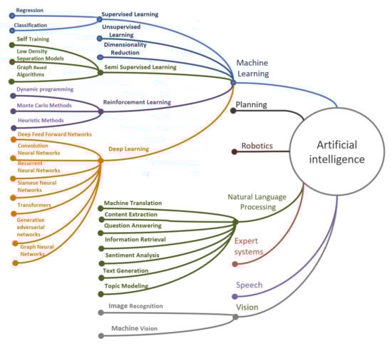 AI includes several major scientific areas, such as machine learning, natural language processing (NLP), text and speech synthesis, computer vision, robotics, planning and expert systems. The AI domains are shown in Figure 3, generated by the authors based on materials [7,34,35].