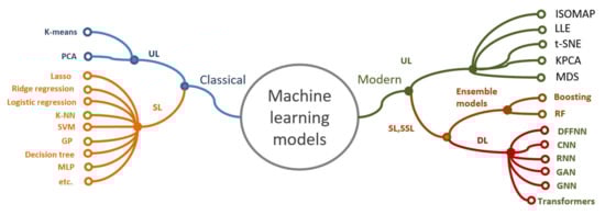 In the context of DL, the concept of transfer learning (TF) is frequently mentioned. TF means improving “a learner from one domain by transferring information from a related domain” [67]. ML models can be conditionally divided into classical and modern ones (see Figure 4) [59]. Without claiming to be comprehensive, the classic SL models comprise the following types: k-nearest-neighbor (k-NN) [68,69], logistic regression [70], decision tree (DT), support vector machines (SVM) [71] and feed forward artificial neural networks (ANN) [72]. The classic UL models include the following types: k-means [73] and principal component analysis (PCA).
