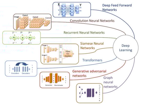 Deep learning is the fastest growing AI sub-domain [36]. DL is a set of methods that employs the so-called deep neural networks, in other words, the networks containing two or more hidden layers. The main advantage of the deep architectures is related to the ability to solve the tasks using the end-to-end method. This approach reduces the requirements towards preliminary data processing, since a signal or image vector is used as an input to the network, and the network independently identifies the regularities relating the input vector to the target variable. The network performs the labor-intensive and complex process of selecting the significant features. This network functioning greatly simplifies the task of the researcher. However, these advantages appear only with a sufficiently large amount of training data and correctly chosen neural network architecture. There are three basic architecture types among the dozens of architectures [83]; the following various modified models are formed from these three basic types (see Figure 5):