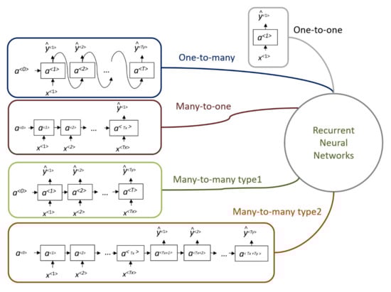 Depending on the input and output sequences, the recurrent networks are divided into four main classes. It should be noted that FFNN can be considered as RNN of one-to-one architecture (see Figure 6).