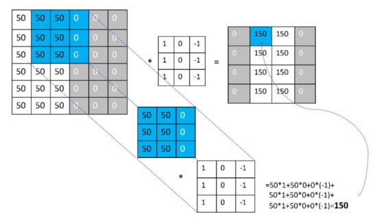 Convolutional neural networks (CNNs) make it possible to single out the complex regularities in the presented data; these regularities are invariant with respect to their location in the input signal vector. They are exemplified by horizontal or vertical lines, or other characteristic features in the image. The scheme in Figure 7 shows a case of a 3 × 3 filter that highlights the vertical lines in an image.