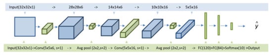 The formation of convolutional filters, or to be more precise, the adjustment of the weights of the neurons modeling such a filter, occurs in the process of network training. Due to the implementation of the convolution operation, the computational complexity of the training process remains within the reasonable limits. CNNs have shown exceptional results in image processing tasks. The development of this architecture of deep neural networks was initiated by the LeNet model [98], which for the first time used convolutional filters, pooling and a fully connected neural network (FC) for image classification. The network contains four convolutional layers and a two-layer fully connected network. The total number of network parameters is about 60,000 (see Figure 8).