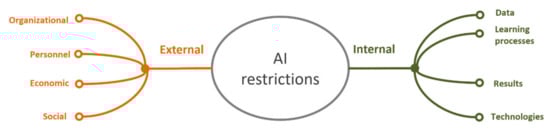 The scientific community identifies the following types of restrictions: organizational [139], personnel, comprising the fear of new technologies (fear of AI) and shortage of data scientists [140]), problems with data including data quality and the large volume of data [141], legal, economic, social issues, etc. [142]. In particular, the authors of [142] identify the following nine problems: data quality, privacy, and security; data biases and technical limitations; “black box”, transparency, and predictability; wealth gap and inequality; economy of developing countries; job displacement and replacement; trust and adoption; ethical and morality issues; legal issues and regulation policy. The study [32] describes the following ten constraints in the process of solving the medical problems: