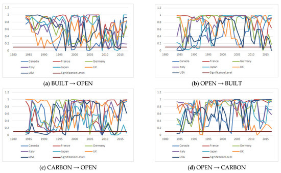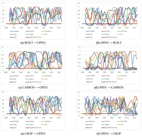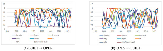 It is important to establish a connection between economic theory and hypothesis testing by investigating the causal relationship of two or more variables. To this end, we first tested the relationship between the environment and OPEN using the dynamic symmetrical causality techniques. In doing so, we checked the causality relationship without considering the positive or negative shocks on variables. The results of the dynamic symmetric causality analysis suggest a bidirectional causality relationship between the sub-components of the ecological footprint and OPEN in many periods. Although the findings in Appendix A reveal a few causality relationships, the results in Figure 1 support the existence of causality for more relationships. For instance, by ignoring instabilities, the findings in Appendix A show that there is no causality relationship between BUILT and OPEN for any countries. However, the first part of Figure 1 shows that there is an episodic causality relationship in the analysis period. Therefore, we can conclude that by testing the causality relationship in a dynamic framework, we can reveal some hidden causalities. Appendix B periodically presents the existence and direction of the relationship between the variables. It is seen that there is a bidirectional dynamic symmetric causality relationship between all sub-components of the ecological footprint and OPEN in G7 countries in different periods. If one considers the OPEN variable in terms of production and consumption patterns, its environmental effect is much more powerful, and improvements in the environmental factors or negative developments can affect the foreign trade balance. Considering all the sub-components of the ecological footprint, Appendix B shows the date ranges for which bidirectional causality exists.