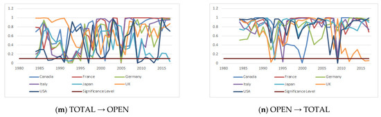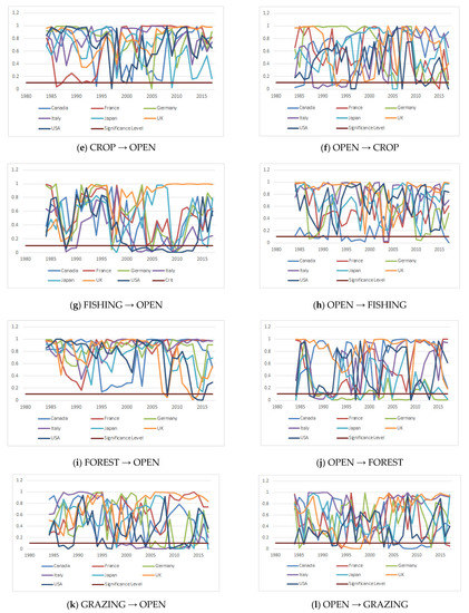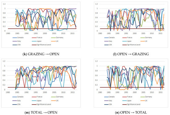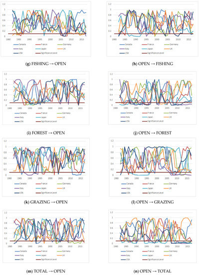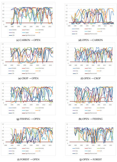 Next, we examined the causality relationship by using symmetric and asymmetric panel causality tests, and the results are presented in Appendix A. The results of the symmetric panel causality test show that there is unidirectional causality from CARBON to OPEN in Canada and Germany, and from OPEN to CARBON in Italy and Japan. We also found that causality runs from OPEN to CROP for Germany and the UK, from OPEN to FISHING for the UK, from FOREST to OPEN for Japan, and from OPEN to FOREST for France, Germany, the UK, and the USA. There exists a causality relationship from GRAZING to OPEN for only Germany, from TOTAL to OPEN for Canada and Germany, and from OPEN to TOTAL for France, Italy, and Japan. To reveal the hidden causality relationship between the series, we also applied the asymmetric panel causality test. The results are tabulated in Appendix A. For positive shocks, we found a one-way causality that runs from GRAZING to OPEN for Canada and the UK, and for negative shocks we conclude that there is a unidirectional causality that runs from FISHING to OPEN for Italy, and from FOREST to OPEN for Japan. These findings prove that considering asymmetric causality may help to reveal the causal relationship that could not be detected by traditional causality tests.