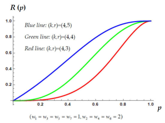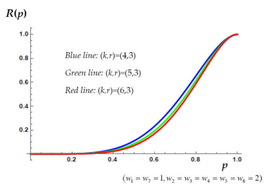 In Figure 2 three systems of order with common weights are displayed. More precisely, the blue line corresponds to the weighted-3-within-consecutive-4-out-of-7: F system, the green line corresponds to the weighted-3-within-consecutive-5-out-of-7: F system and the red line corresponds to the weighted-3-within-consecutive-6-out-of-7: F structure. It is readily observed that all the structures displayed in Figure 1 share common values for design parameters . Based on Figure 2, we readily deduce that, as parameter k increases, the resulting system weakens its reliability. Among the cases illustrated therein, the worst design seems to be the one with k = 6 (while the remaining parameters do not differ). It is easily observed that larger values of k do not seem to be optimal choices.
