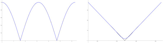 On the other hand, Figure 6 (at the right) presents the Lagrange interpolation polynomials of the absolute value based on the roots of (in black) and on the roots of (in blue); it is remarkable that the Gibbs–Wilbraham phenomena are completely different in shape and extrema.