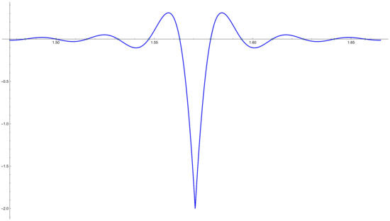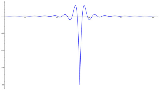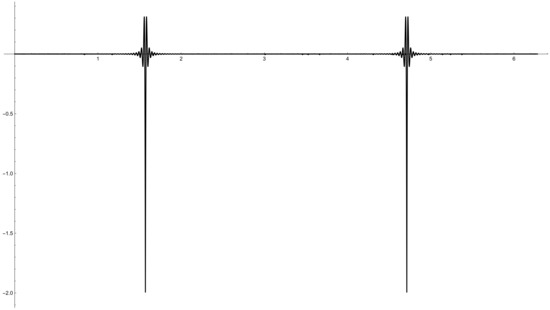 Figure 3 gives a good idea of the Gibbs–Wilbraham phenomenon. It presents the difference between and multiplied by , that is, . It is clear that far enough from , this difference is close to 0. On the other hand, when we are near the singularities, the function presents an oscillatory behavior. This behavior is more pronounced the closer we get to the singularities.