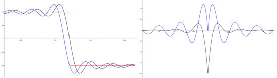 In Figure 6 (at the left), we represent the Lagrange interpolation polynomials of the jump function based on the roots of (in black) and on the roots of (in blue); it is remarkable that the Gibbs–Wilbraham phenomena are similar in shape and extrema.