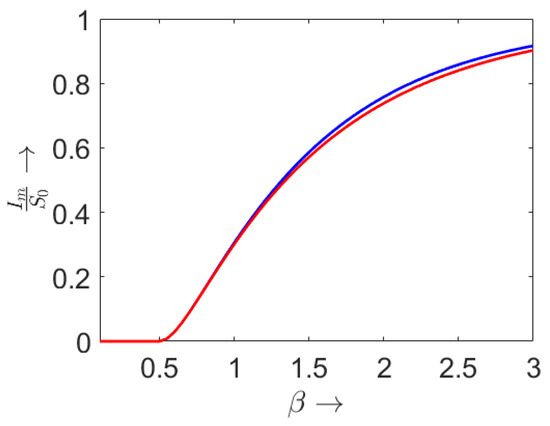 In Figure 3, we show a comparison between the maximum number of infected obtained by Equations (21) and (23) and the maximum number of infected obtained by direct numerical simulation of the delay model (9). From Figure 3, we can observe that the approximation gives a very close upper bound to the maximum number of infected.
