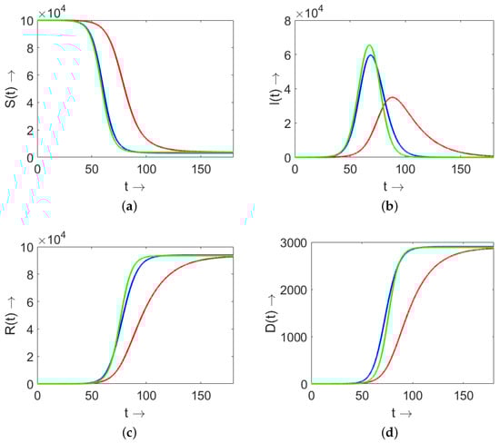 Comparison of the solutions of the distributed model (3) (blue curve), the delay model (9) (green curve), and the conventional SIR model (4) (red curve). (a) Susceptible , (b) infected , (c) recovered , and (d) dead . The values of parameters: , , , for the SIR model ; for the delay model ; for the distributed model (3): , , , , .