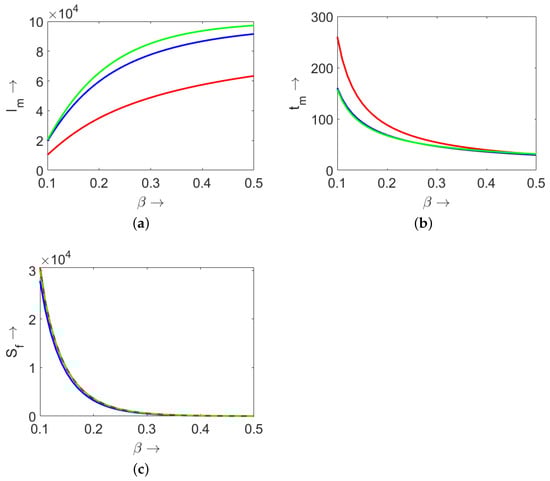 Comparison of the maximal number of infected individuals (a), the time to reach the maximal number (b), and the final size of the epidemic (c) for the distributed model (3) (blue curves), the delay model (9) (green curves), and the SIR model (4) (red curves) for different values of . The values of parameters: , , for the SIR model ; for the delay model ; for the distributed model (3): , , , , .