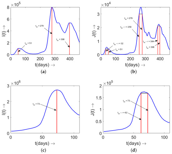 Let have the maximum at . Set . Then, , i.e., the daily number of infected is the same at two different time points and . From the real data of the infected individuals , we can find the day on which the daily number of active cases is maximal, and it determines . From the data of daily reported cases , we can observe that crosses its maximum at some time before . Now, we have to find the value of such that will be equal to , which in turn determines the disease duration . Hence, considering the delay model, using the real data of daily new cases and active cases around a peak, we can find the disease duration .