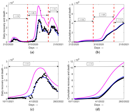 The blue curves show the number of recovered and dead in the delay model; the magenta curves correspond to in the SIR model; the black dots correspond to the 7-day moving average of daily recoveries and death in Italy. (a,b) from 21 February 2020 to 21 May 2021; (c,d) from 10 November 2021 to 28 February 2022.