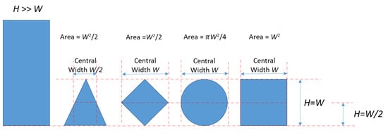 The 1D and 2D targets. The rectangular target is a 1D target with a height greater than its width. The 2D targets are shapes with equal height and width. However, the central width that crosses the half-height (H = W/2) might not be the same.