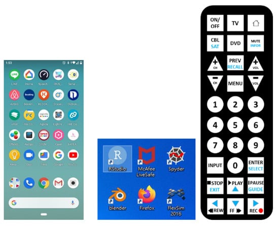 The shaped icons in modern electronic devices. On the left are the circular widgets in the Android smartphone. On the center are square widgets in the Windows system. They appear to have arbitrary shapes until indicated by the mouse cursor. Finally, on the right is a universal remote controller with buttons of equal height and width in real life.