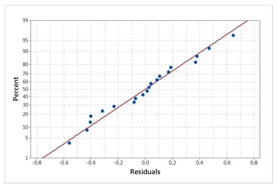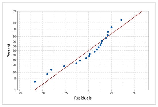 The effect of the lack-of-fit test is illustrated in Figure 3 and Figure 4. Figure 3 shows the worst case for the amplitude of 256 pixels and IDFitts in the Canon model. Oppositely, Figure 4 shows the excellence of the SQRT_MT model in the A1024/IDarea_Shannon condition. A more significant deviation from the line in Figure 3 implies the violation of residual normality. Oppositely, the residual error of the SQRT_MT model shows a compact fitting with the line in Figure 4.