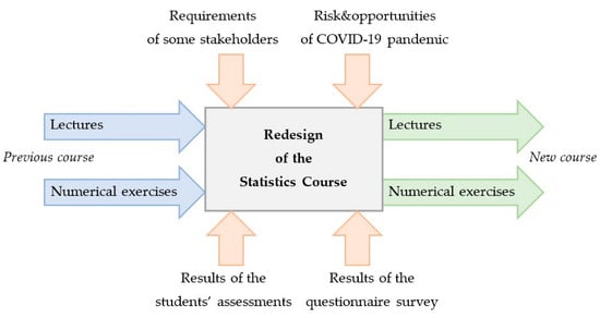 This article focuses on the redesign of the Statistics course taught at the Institute of Control and Informatization of Production Processes. One of the limitations of this study is the fact that the research was conducted only at this institute. It identifies and generalizes the requirements of some stakeholders (students, teachers, university, and employers). The article analyses and compares the results of the overall student assessments from the Mathematics course and the Statistics course. It identifies and explores the opinions of graduates of the course by using an anonymous questionnaire survey. The study reflects on teachers’ and students’ experiences with online teaching during the COVID-19 pandemic. The article builds on positive experiences by using active-learning elements in the Mathematics course.