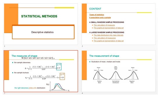 Based on the responses to RQ1 and RQ2, as well as the results from the questionnaire survey, a change in the Statistics course (RQ3) was desired. The redesign of the Statistics course was mainly inspired by the requirements of the practice, the requirements of the graduates of the course, as well as the development of new learning technologies. An effort was made to enhance the development of soft skills (teamwork, presentation skills, critical thinking skills of students, etc.) and to reduce students’ concerns about the difficulty of completing the course.