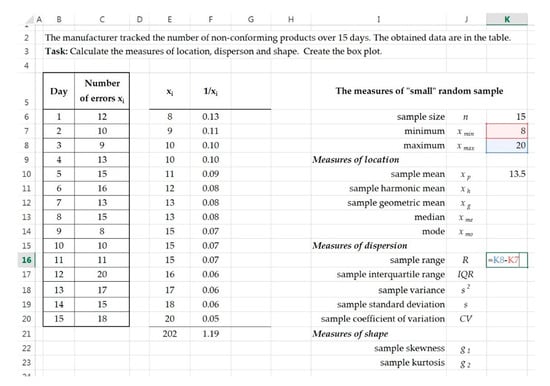 The students solve the examples by using a spreadsheet. Its advantage is that it makes calculations easier for students, but at the same time leaves them enough space to understand and learn the procedures of the methods discussed (Figure 3). The possibilities of the graphical display of the results are sufficient for the topics covered of Descriptive Statistics and Inductive Statistics.