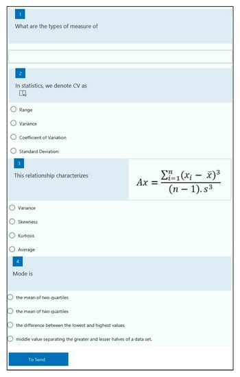 During the pandemic, the entire final evaluation moved to the online space. The lecturer replaced the written answers with a test with 40 questions from all the topics covered. The test is prepared in Microsoft Forms and takes 35 min. This application displays to individual students both the questions and the offered answers to the closed questions in random order. This reduces the risk of write-offs. The practical part of the final assessment has changed in that each student individually solves their two randomly selected examples for a maximum of 60 min, sharing their screen with the lecturer in Microsoft Teams. The lecturer can guide the student in solving the examples, but not in completing the test.