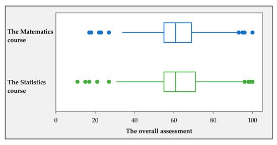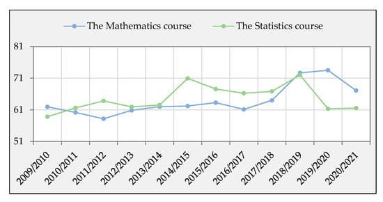 The authors of the article asked three research questions (RQ1–RQ3). From the processed data from MAIS, it was found that there was no statistically significant difference in the overall assessments of students in the Mathematics course and the Statistics course (RQ1). Students perform comparably in both courses. Since the 2010/2011 academic year, the overall assessment in the Statistics course has been several points higher than the overall assessment in the Mathematics course. Over the last 2 years there has been a 10-point drop in the Statistics course assessment (RQ2). On the other hand, the Mathematics course rating has improved in the last three years. The difference between the courses observed can also be seen in the number of remedial and second remedial of term assessments.