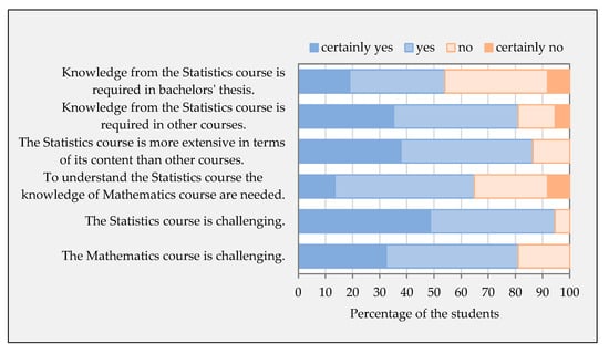 Science courses, including the Statistics course, sometimes raise concerns for students [3,4]. The concern can be the gap between the theories presented in lectures and exercises and their practical application in professional life. Students perceive the lack of lectures and the increased ratio of personal responsibility for their learning as unfair and unreasonable [5]. Some students have low motivation to study these courses [3]. Their reading comprehension (as self-reported) with an understanding of statistics is not always strong [6]. In addition, students’ self-confidence is lower; they don’t know what to expect from Statistics courses [7]. Unmotivated students are often passive during class. They are interested in passing the exam with as little effort as possible, and therefore they are often satisfied with a lower evaluation. Another reason may be students’ doubts about their abilities. They are hesitant as to whether they can learn statistics and whether they can deliver the required performance [6,8,9].