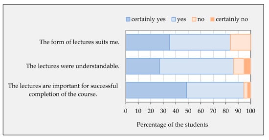 Teaching during the COVID-19 pandemic has brought some risks, but also opportunities. Teachers and students acquired new skills and competencies (Cisco Webex, MS Teams). Similar experiences were published by Pócsová et al. in their study [11]. Students’ time management, systematics, ability to give and receive constructive criticism, and to develop critical thinking have improved. Some of these opportunities and elements mentioned above, have been considered by teacher teams for the redesign of the course (online meetings, streaming lectures, etc.). Many risks in changing to a full-time form of teaching have disappeared. Of the remaining ones, the most important is the risk of teachers using different online platforms for different courses, or even within a single course. Should a new pandemic emerge, teachers would be better prepared to handle it.