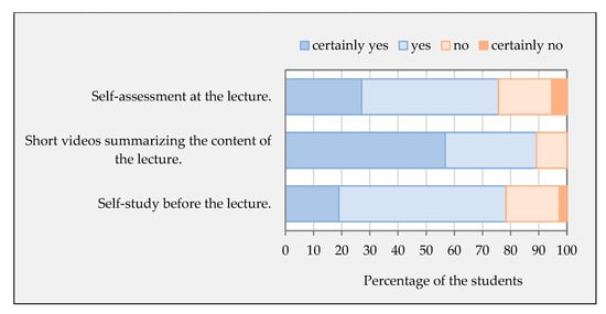 Another concern of the study from the teachers’ side is that elements of active learning require expert knowledge and more effort in the preparation of teaching material [5]. It is important to include active learning in the curriculum of several courses and to harmonize the assessment methods of several teachers. It is also more precise to answer and follow up on individual questions of students and to choose the right tasks and projects [6,7,8].