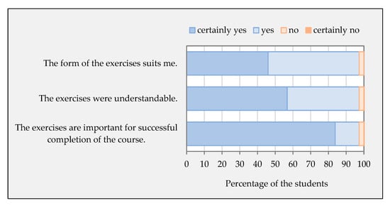 In response to the question What would contribute to a better understanding of the material and mastery of the subject? (Figure 16), students selected the following from the suggested alternatives: group solving of multiple examples (75.68%), self-assessment after the exercise (72.97%), checking students’ readiness for the exercise at the beginning of the exercise (62.16%), and self-study before the exercise (59.46%). Individual work in solving the problems is not considered by the students to be a form of work that would contribute to the improvement (64.96%).