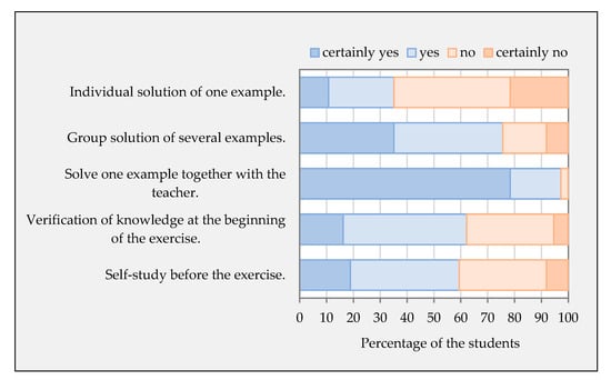 It also requires an active approach by students to solve tasks and questions at home before class [17]. Even during the lectures, the lecturer shares knowledge with students based on discussion and questions, solutions of practical examples [18]. The exercises include creative and individual ways of solving problems, cooperation, and sharing of procedures with subsequent discussion. If the discussed topic allows, it is up to the lecturer to be able to involve even less-motivated students [19,20].