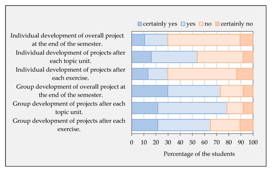 The results published by Donohue and Richards in [8,9] show that there was resistance when dividing the class into pre-assigned teams, as judged by the observed non-participation of some students and through feedback. Students preferred to choose their own team to work with rather than when they were assigned. Some students reported that they preferred to work independently. Students in the group were not always “time efficient”, had different workloads and did not have the same level of knowledge [6,8]. Considering our survey results, in which graduates request a strengthening of group work, the redesign of the course proposes the introduction of alternative groups and individual work. The composition of the groups will vary from topic to topic. The composition of the groups will be decided by the students with the teacher. Shinaberger [4] shows that students’ absences during active learning in class resulted in larger gaps in learning. Streaming of our face-to-face lectures and exercises will help to solve the above problem.