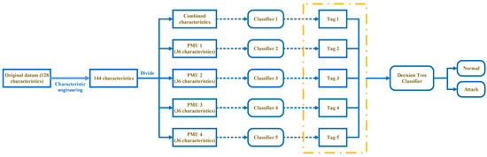 A model architecture diagram is shown in Figure 2 to detect faults and cyber-attack in electrical grids [24]. According to Figure 2, the model architecture usually consists of four stages: property making, data dividing, weight voting, and layout training as follows: