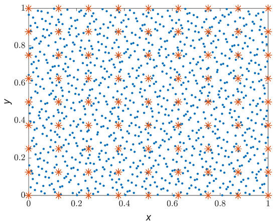 Here, 1089 data points presented as dots and 81 center points presented as stars in the unit square in .
