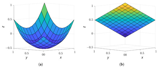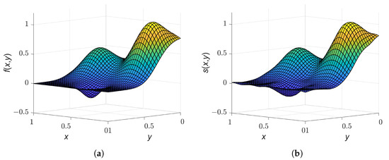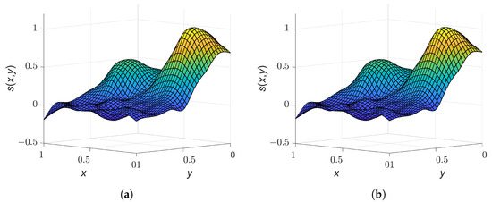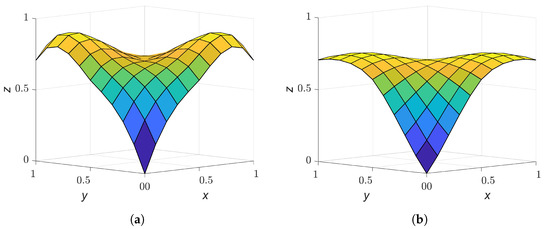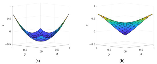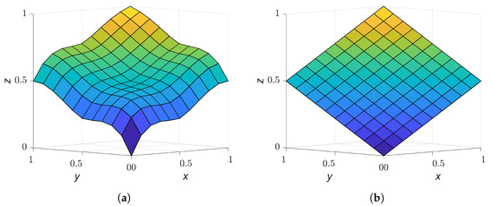 Table 9, Table 10, Table 11 and Table 12 show the given data sets for each numerical example. Figure 9, Figure 10, Figure 11 and Figure 12 present the interpolated surfaces obtained from both cases where in case (a) no polynomials were added to the interpolation function and no constraint equations were introduced, and in case (b) three polynomials were added to the interpolation function and three constraint equations were taken into account.