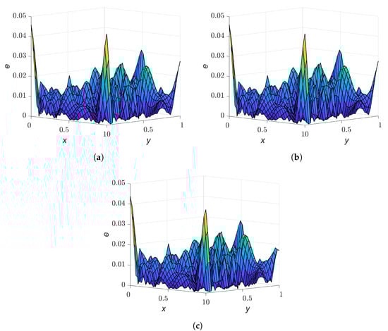 In the case of dense point clouds, such as those obtained from terrestrial laser scanning, only a small influence of the polynomial terms on the approximating surface is to be expected. This can be seen, for example, when comparing the approximation with polynomials in Figure 3b with the one without polynomials in Figure 3c on the basis of the absolute numerical differences between the values of the original surface and the values of the approximated ones. Even when the noise level was increased from to , there were no significant differences in the resulting approximated surfaces with and without polynomials and constraint equations, see Figure 4.