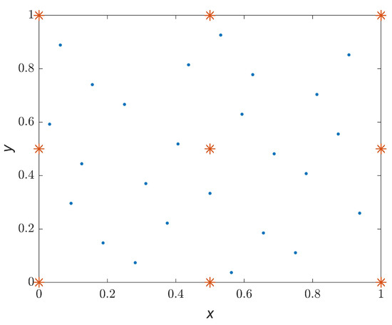 the “measurements” (noisy data) are created taking into account a set , with , to which of normally distributed random noise is added. The number of data points is 25, thus resulting in a sparse point cloud of a more curved surface. Moreover, a set , with , of uniformly distributed center points, is given. The number of center points is 9. The files with the data points and the center points are taken from the CD in the appendix of the textbook by Fasshauer [4]. Figure 5 shows the positions of the data points together with the coordinates of the center points.