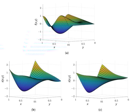 As Harder and Desmarais [7] explained, the thin-plate spline function has a physical interpretation which is a plate of infinite extend that deforms in bending only. Since the bending energy is represented by the integral of the partial derivatives, the minimal bending energy of the surface that Duchon [8] was interested in is approximately equivalent to the minimal integral curvature, and hence with the minimum of the functional of second derivatives. For this minimisation, Duchon [8] defined a semi-norm in the infinitely dimensional vector subspace of functions of finite energy. Furthermore, since linear polynomials defining a plane are equal to zero in their second derivatives, they are also included in the interpolation function. Finally, Duchon [8] proved that the functions, thin-plate splines and polynomials can be used as a basis for surface interpolation, and the space of this basis is a subspace of the infinite dimensional Hilbert vector space of all real functions of two real variables. Later on, this form of interpolation presented by Duchon [8] was widely used in the literature, for instance, by Buhmann [9], by Wendland [3] (p. 116ff.), by Fasshauer [4] (p. 70ff.), and by Flyer et al. [5], to name a few, when interpolating with thin-plate spline functions.