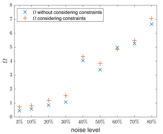 Firstly, it can be stated that the value of the objective function (10) increases with increasing noise level, because the residuals become larger. Comparing the solutions with and without consideration of polynomials and corresponding constraint equations, it can be observed that up to a noise level of , the value of the objective function is larger with consideration of polynomials and constraint equations than without their consideration. This indicates a stronger smoothing of the approximated surface, which then results in larger residuals. At a noise level of , the solution with polynomials and constraint equations yields a slightly lower value of the objective function, above which the situation described previously is again apparent.