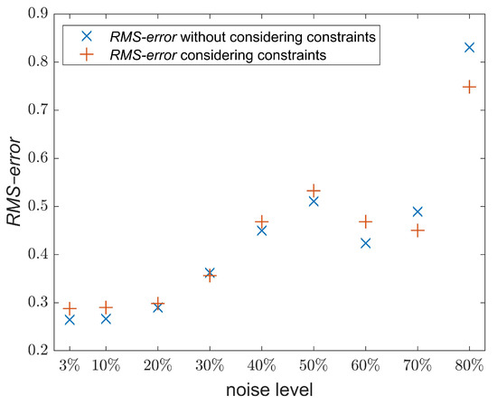 To evaluate how the solutions at different noise levels for the observations affect the shape of the approximated surface, the RMS–error (46) can be used, see Figure 8, as it describes the deviation of the approximated surface from the original one given by (47).