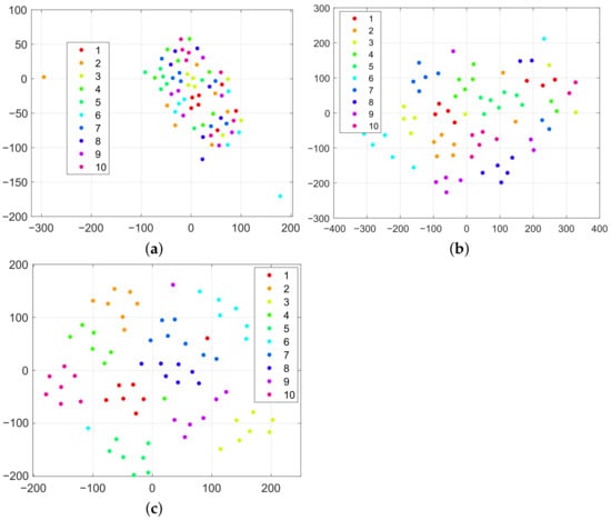 To further illustrate the effectiveness of using the SOIGO, we visualize the original data, the first-order IGO, and the SOIGO on the AR database by employing the t-SNE algorithm [35] in Figure 3. These data are selected from the first ten subjects on the AR database; for each person, seven nonoccluded face images in Session 1 are used. Then, these images are occluded by a square baboon image with a percentage of 30%. For detailed experimental settings, please refer to Section 4.3. As can be seen from Figure 3, though the first-order IGO looks better compared with the original data, clusters of different classes are mixed together. In Figure 3c, the cluster of the same class is more compact than that of Figure 3b, which is beneficial for subsequent classification.