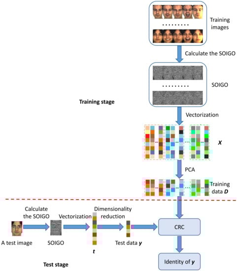 The procedures of obtaining the projection matrix is the same as in IGO-PCA. Then, for a test image , we first compute its SOIGO and obtain after the mapping defined by Equation (4). Embeddings of training and test images are derived as follows: