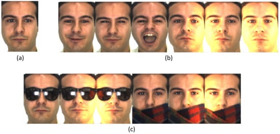 Some example face images from the AR database: (a) the neutral image of a subject from Session 1; (b) face images with illumination and expression variations; (c) images occluded by sunglasses/scarf.